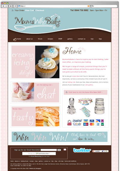 Details: Vicki at Mums Who Bake needed an identity for her idea of an online shop and baking community for all those frustrated bakers out there. She wanted the brand not only to identify with the personal gratification of baking, but also with the memories of baking with mum as a child; the smell, the taste and the warm feelings inside. The website needed a bespoke forum, a photo gallery that Vicki herself could add to, and an online shop.